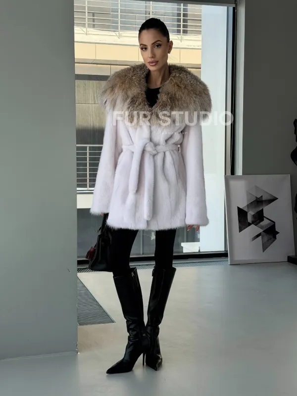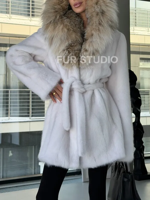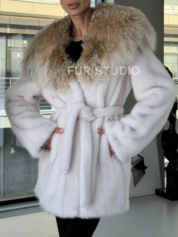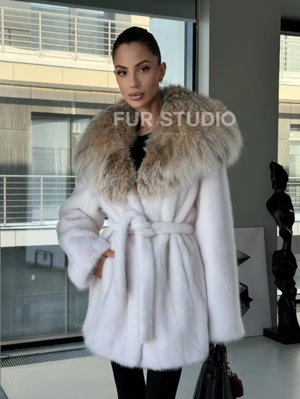 Мех данной шубы аукционная норка, цвет белый. Предлагается в размерах от 42 до 50. Длина модели 75-80 см, что выгодно подчеркивает фигуру девушек. Эта модель идеально подойдет для девушек и женщин, предпочитающих роскошные натуральные меха.