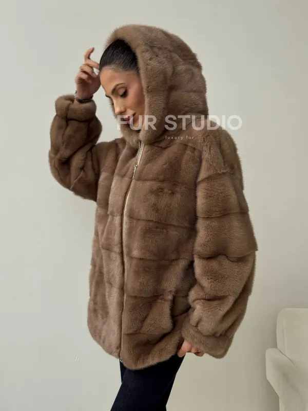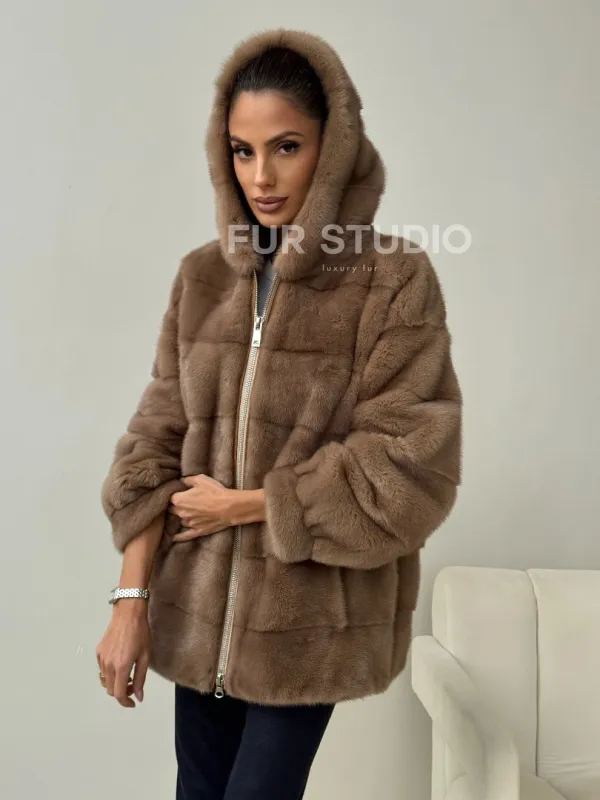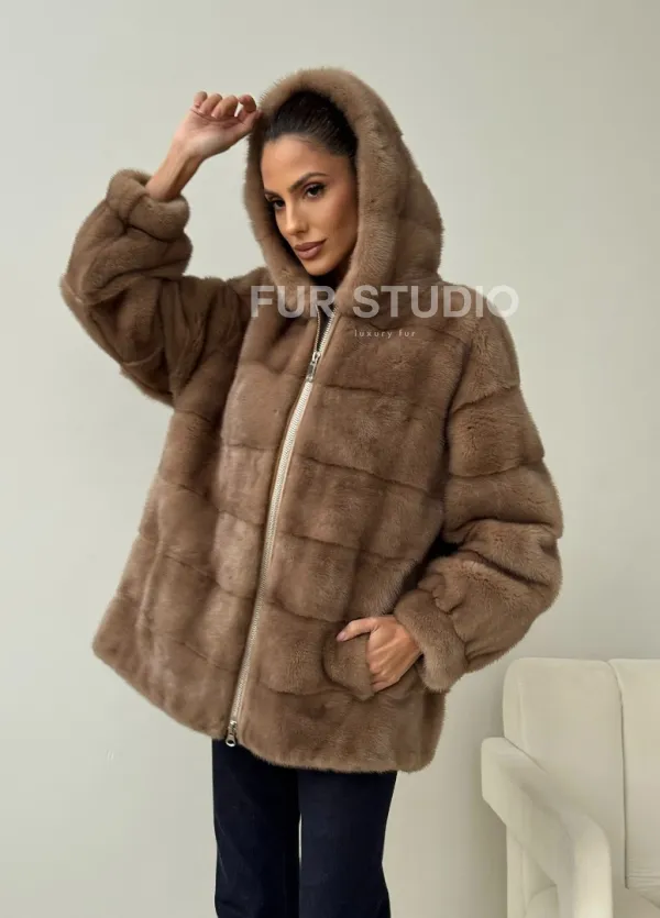 Бежевая норковая куртка с капюшоном 102430